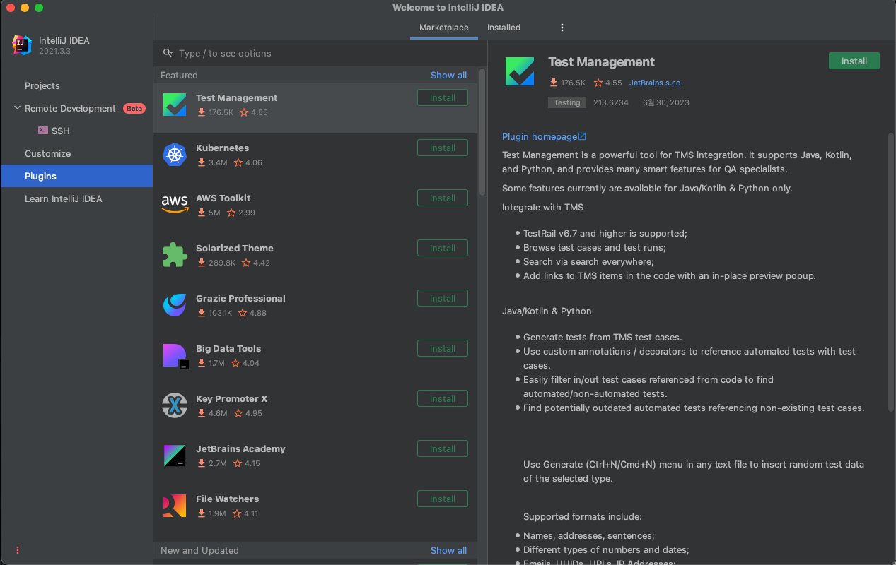누르면 이 화면이 보이는데 가운데 위쪽에 Marketplace에서는 원하는 걸 검색해서 Install 눌러 다운로드할 수 있고